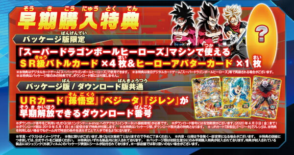 グレートサイヤマン3号が基本的なバトルのルールや画面の見方などを実践形式で説明をしてくれるので直感的にバトルを学んでいくことができる! 超戦士たちが偉人として扱われるようになったとある世界で、謎の戦士「グレートサイヤマン3号」に導かれ、『ドラゴンボールヒーローズ』の一員となり、新たなる危機に挑む、本作オリジナルのストーリーモードも搭載!ストーリーには、「ドラゴンボール超」を連載しているとよたろう先生がキャラクターデザインをした「シーラス」が登場!今までにない新たな視点で贈るまだ誰も知らないドラゴンボールワールドを体験せよ! シリーズ初のオンライン対戦モードを搭載!実力の近い相手と気軽にバトルできる「レギュラー対戦」、ライバル達とランクを競い合う「ガチ対戦」、友達同士で闘うことのできる「フレンド対戦」の3種類のバトル形式を搭載!遠く離れたプレイヤーと対戦し、トップランカーを目指そう! 前作でも人気を博した「クリエイションモード」がさらに進化して登場!必殺技を自由にカスタマイズできるアクセサリーが新たに加わったことで、好きなキャラクターに思い通りの必殺技をカスタマイズすることが可能に!さらにユーザーからの要望が多かったBGMのカスタマイズなど、さらなる進化を遂げた「超クリエイションモード」を体感せよ! 【早期購入特典】 ◆デジタルカードゲーム「スーパードラゴンボールヒーローズ」マシンで使えるSR級バトルカード×4枚&ヒーローアバターカード×1枚【バトルカード…孫悟空:ゼノ/ベジータ:ゼノ/トランクス:未来/???】 ※本特典はデジタルカードゲーム「スーパードラゴンボールヒーローズ」で使用できます。